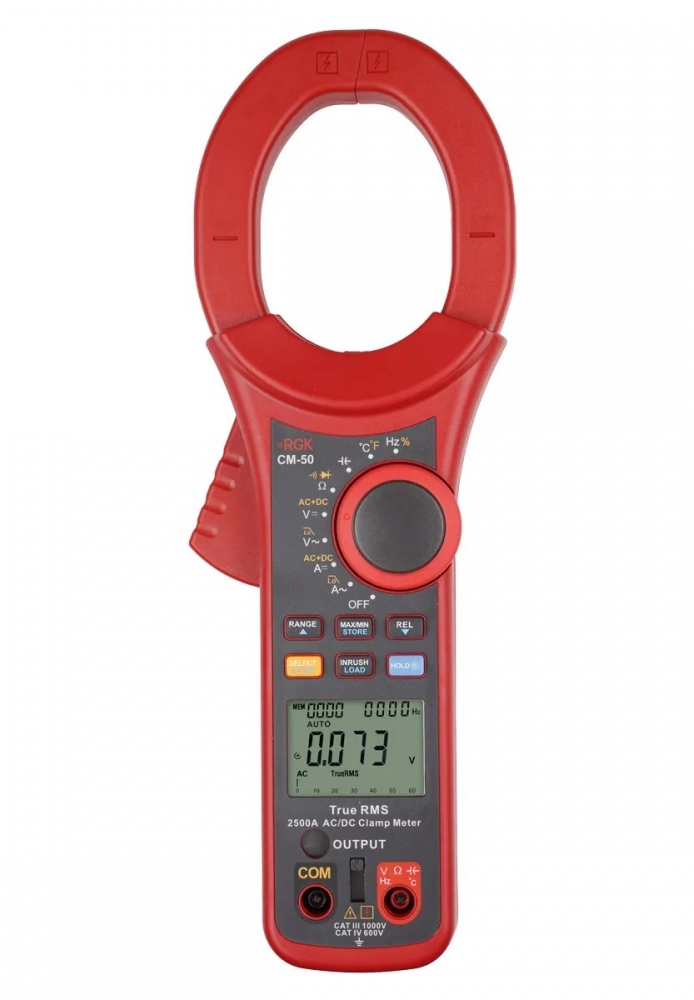 Клещи токоизмерительные RGK CM-50 - профессиональный прибор для замеров силы тока до 2500A бесконтактным методом. Инструмент автоматически выбирает рабочий диапазон и определяет тип тока - постоянный или переменный, что позволяет работать более эффективно, без лишних затрат времени на настройку.